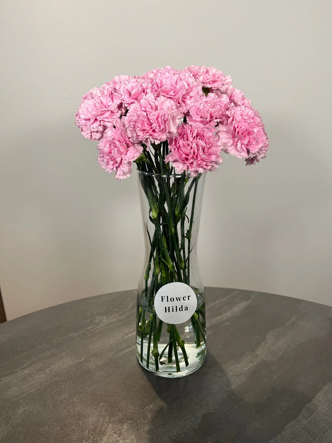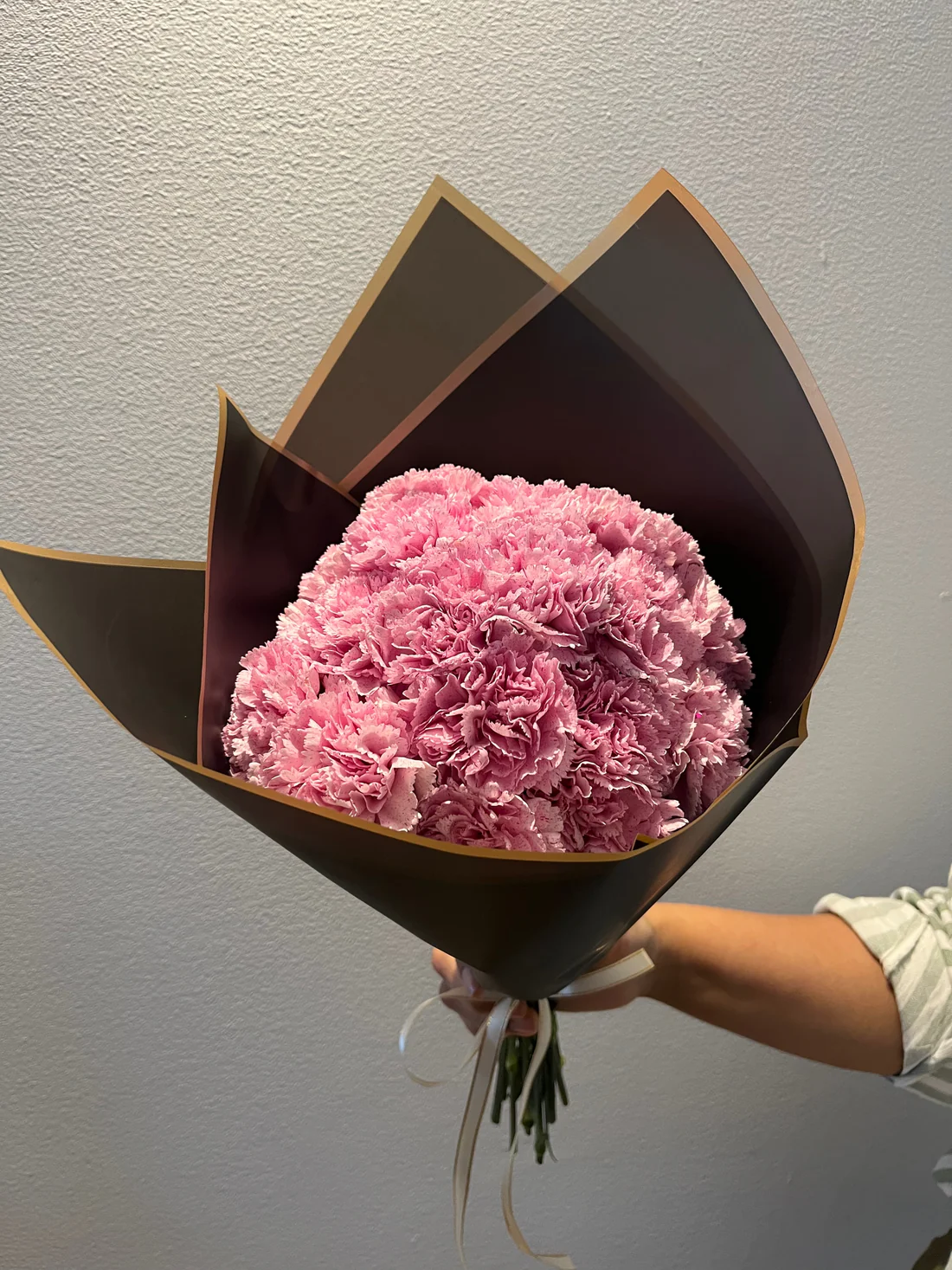Un ramo que homenajea lo clásico con un toque moderno: 25 claveles rosas de tallo largo, seleccionados por su tonalidad suave y su fragancia sutil. Envuelto en papel kraft crudo para un look rustic-chic, ideal para quienes buscan ternura sin cursilería.