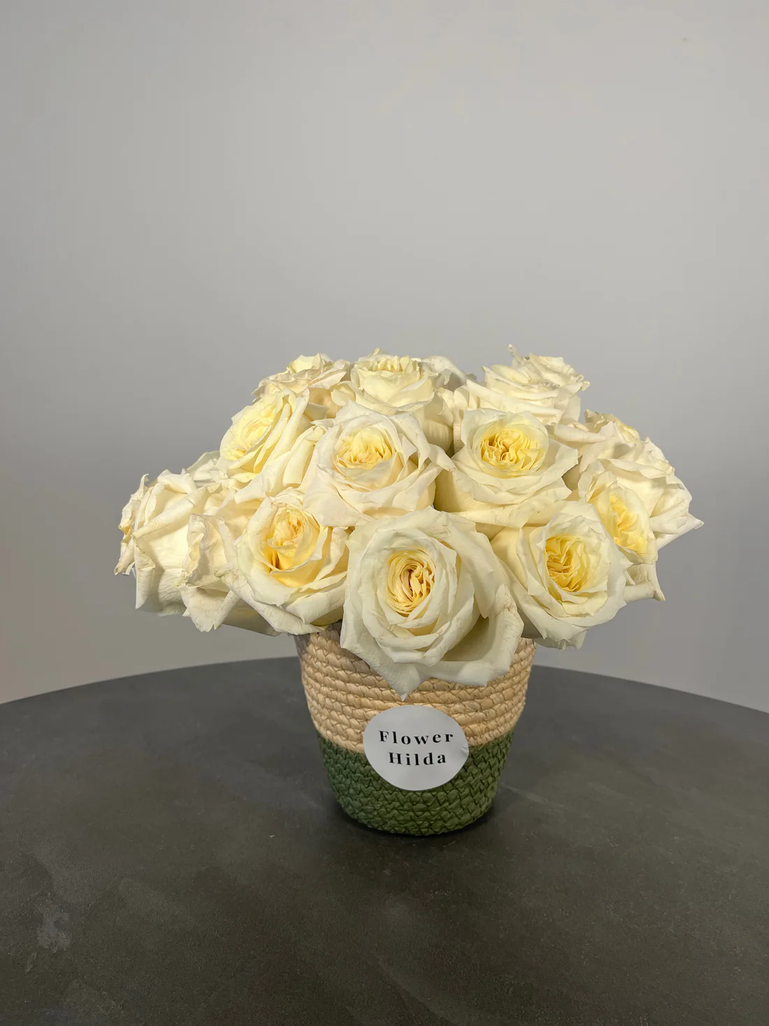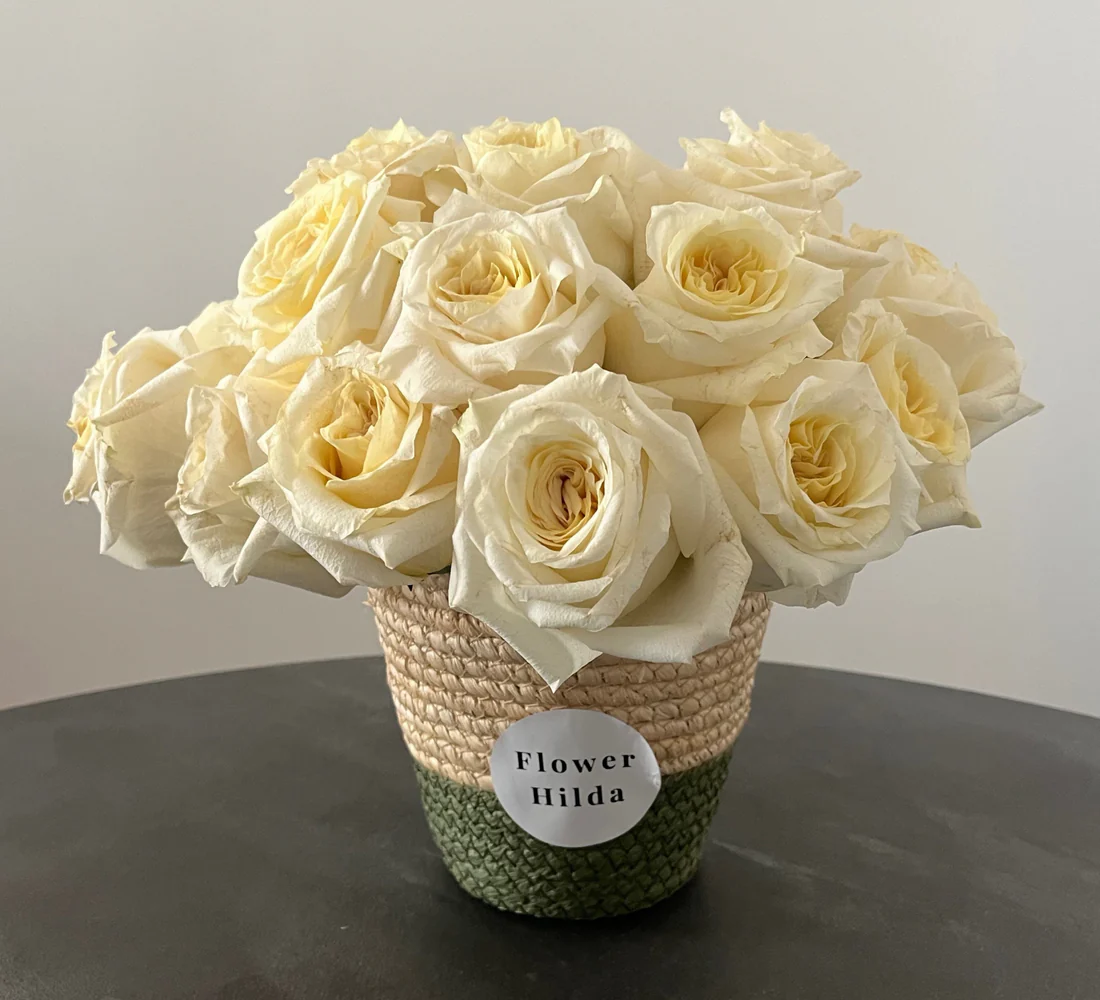 Un jardín minimalista en una caja: rosas blancas de tallo corto, frescas y compactas, arregladas en una cajita de mimbre (como las de los mercados de Provenza, pero upgraded).