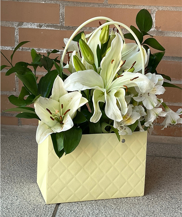 Lirios blancos + alstroemerias blancas en cartera floral: pureza en tus manos.
