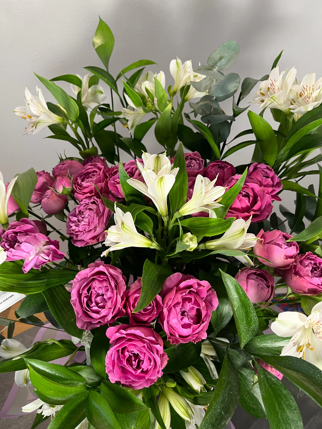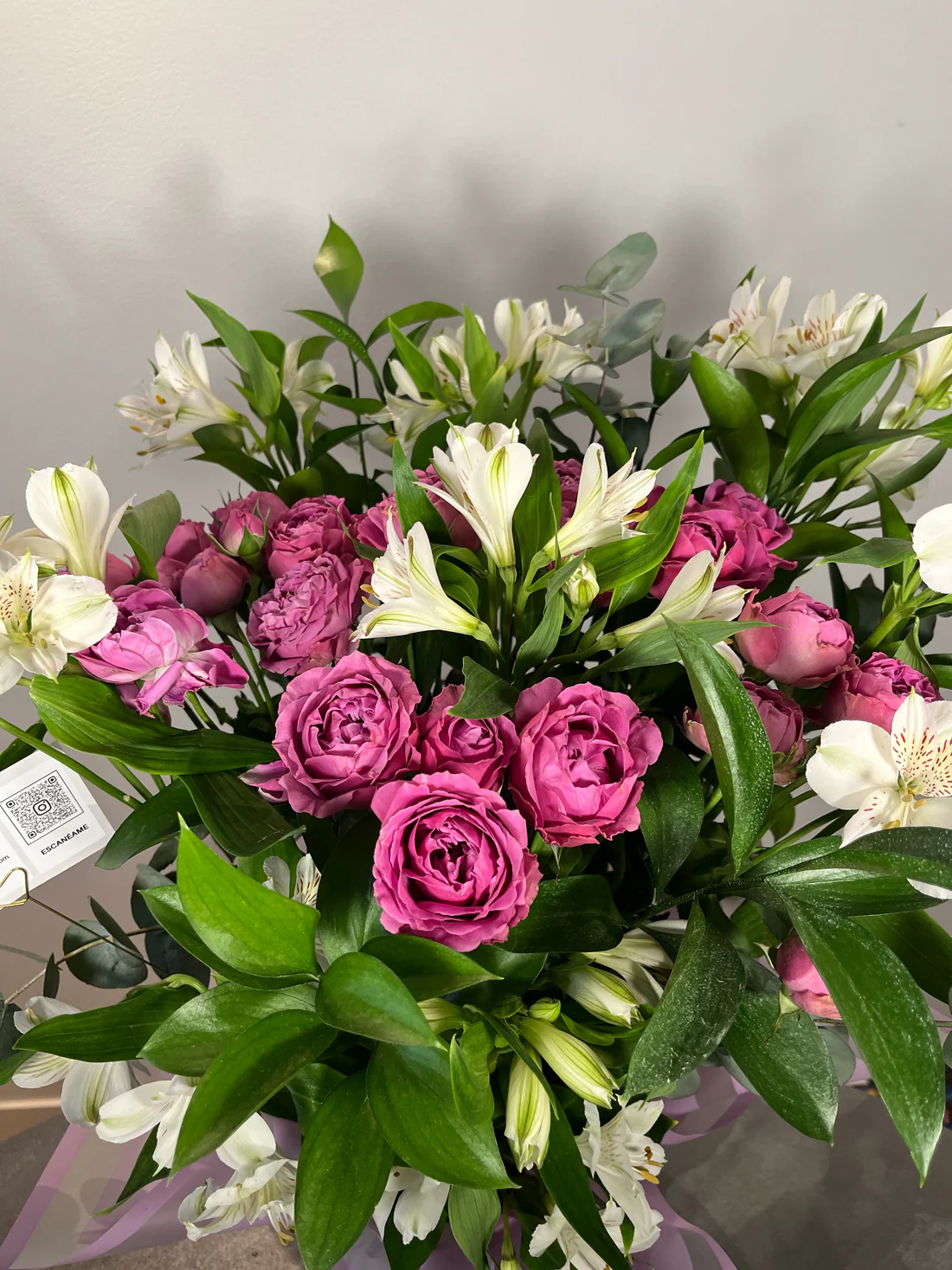 Este redondo de alstroemerias y rosas fucsias es pura energía: flores frescas, duraderas y con pétalos que parecen pintados a mano.
